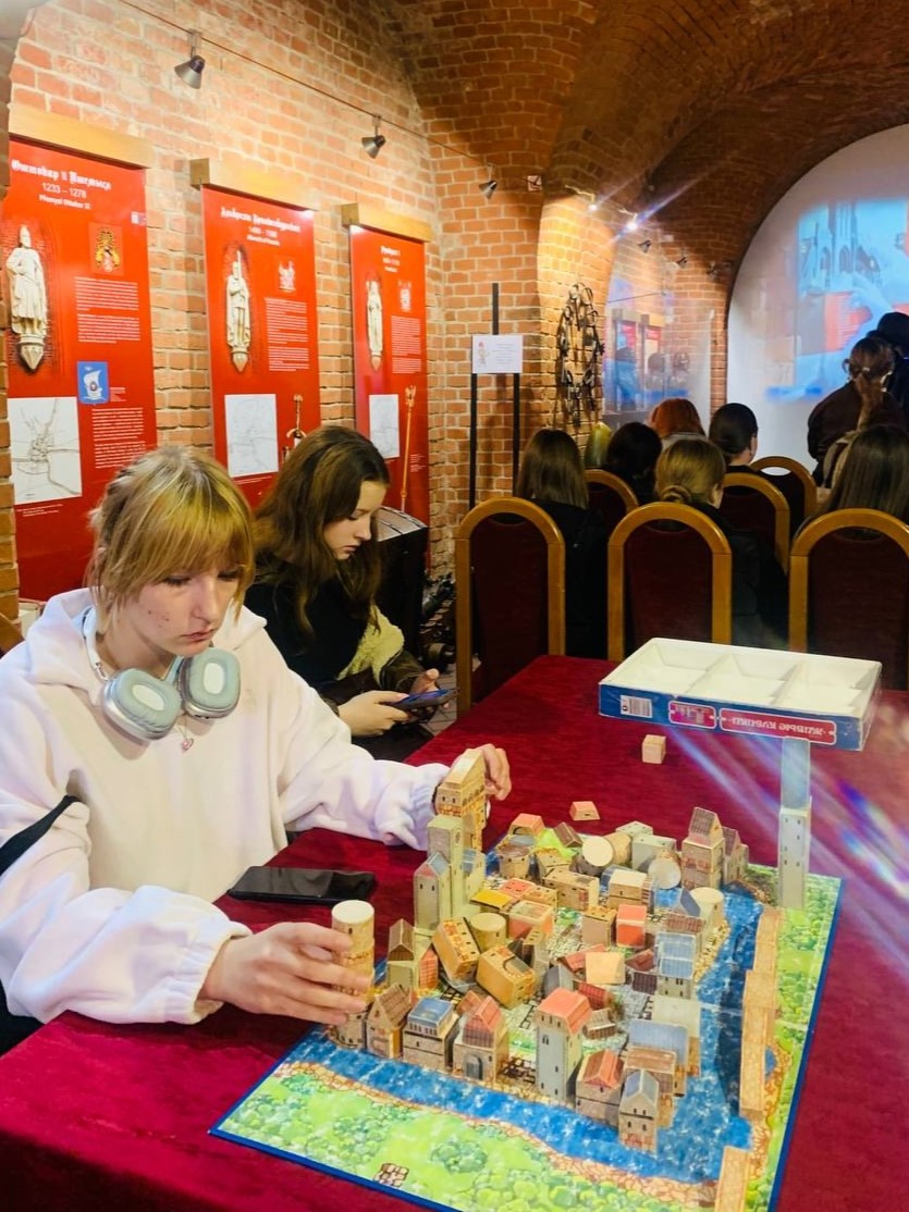 Далее сотрудница музея любезно рассказала студентам об истории Королевских ворот, как фортификационного сооружения. В выставочном зале "Под Российской короной" студенты познакомились со страницами истории Восточной Пруссии в составе Российской империи. В экспозиции представлены копии документов, фрагменты гравюр, схемы и карты, исторические справки. На противоположной стороне зала располагается стенд, где присутствуют изображения известных личностей, которые в разные времена бывали в Кёнигсберге. Студенты узнали, что здесь были известные русские писатели и поэты, такие как: Тургенев И., Есенин С., Гумилев Н., Маяковский В., а также некоторые русские императоры и полководцы. Отдельная группа студентов за одним столом увлеклась собиранием из кубиков города Кёнигсберга на карте. А другая группа увлеченно смотрела и слушала документальный видеоролик о Калининграде.
