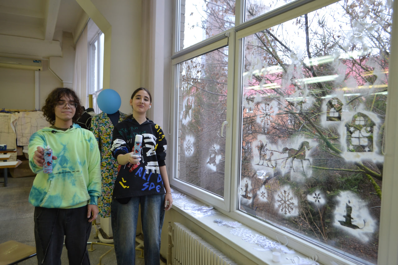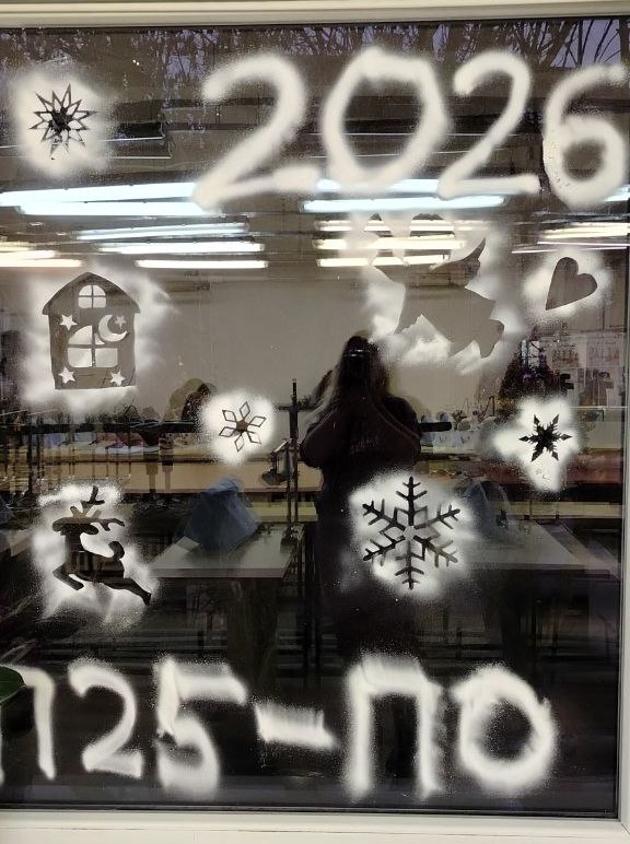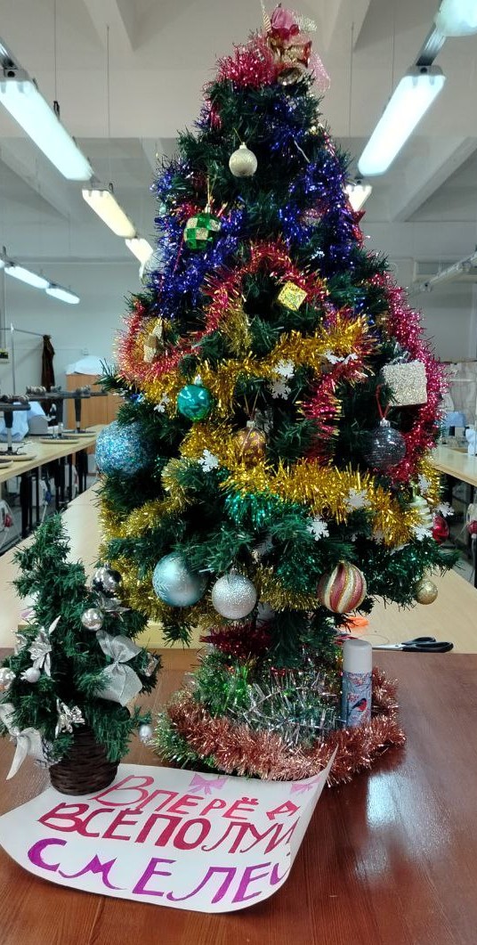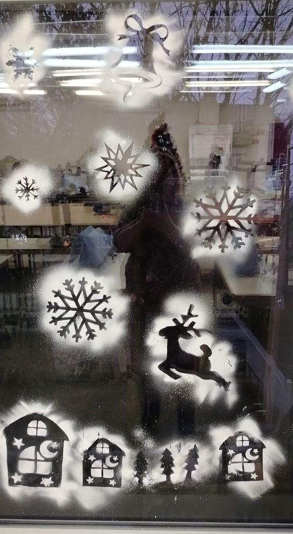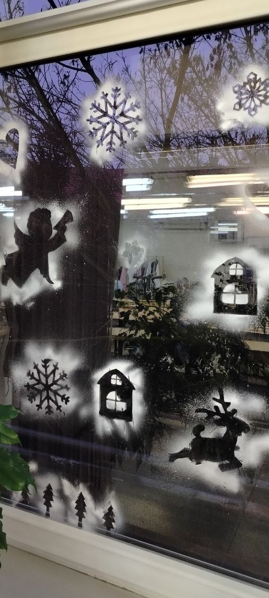 Девчата и ребята из группы «Портной» с энтузиазмом украсили свое пространство - любимый швейный цех, нарисовав свою новогоднюю сказку на окнах. Дружно вырезанные трафареты скомпоновали в знакомые с детства зимние сюжеты. И вот уже ангелы громко трубят о наступлении долгожданных зимних праздников, звенят серебряные колокольчики, мимо елей скачут быстроногие олени и добрый дед Мороз мчится на санях, развозя подарки в уютные домики, укрытые пушистым снежком. Зима рисует узоры из ажурных снежинок, создавая мир, полный тишины, света и предвкушения чудес, а в стихах оживает сказка: