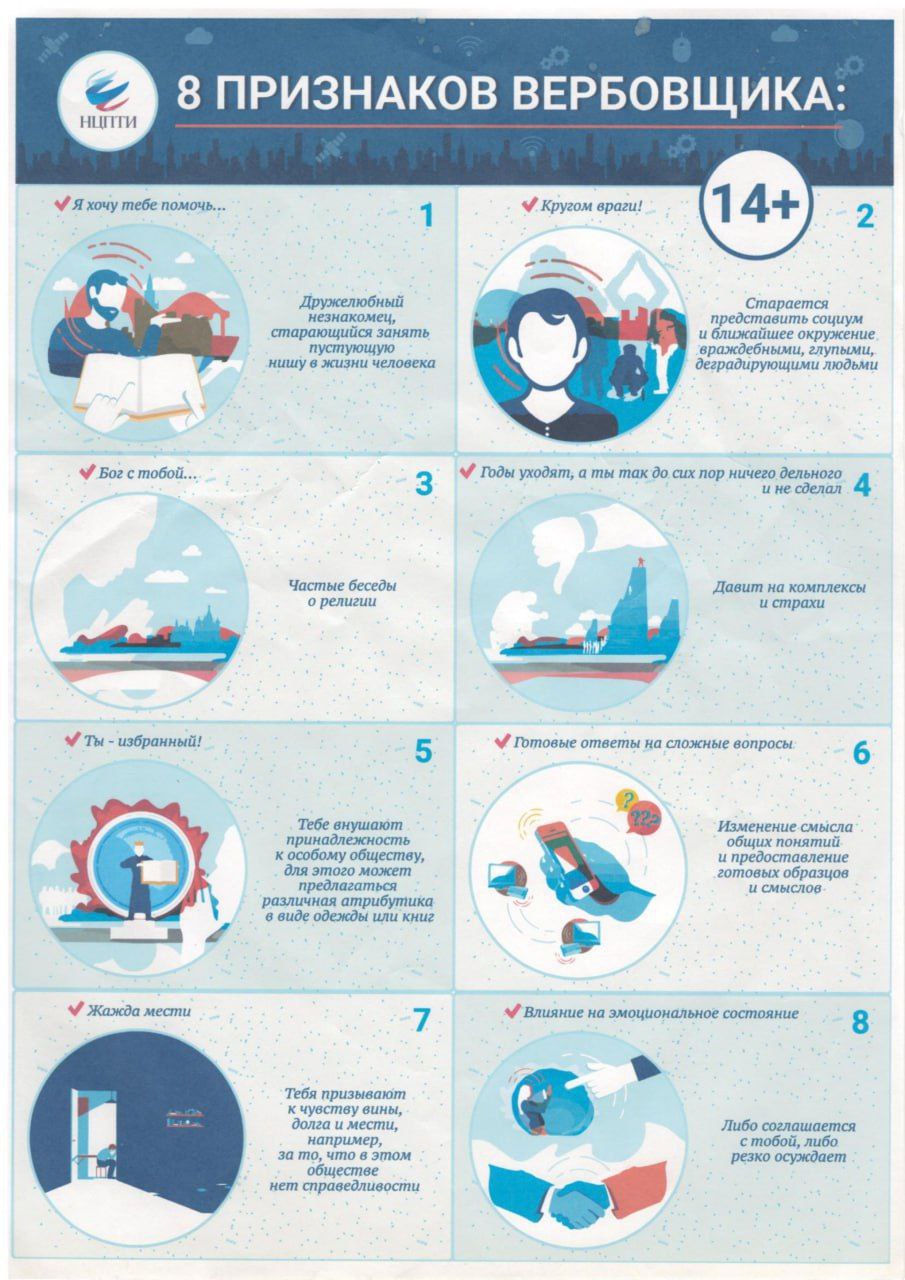 Студенты узнали, как распознать в собеседнике вербовщика, а также алгоритм действий в подобной ситуации. В рамках занятия был показан фильм - история обучающегося, которого вовлекли в террористическую деятельность. Во время просмотра спикер и студенты обсуждали какие действия можно было предпринять, чтобы предотвратить преступление. Главным выводом стало правило: люди не должны отворачиваться друг от друга, общество должно быть цельным.